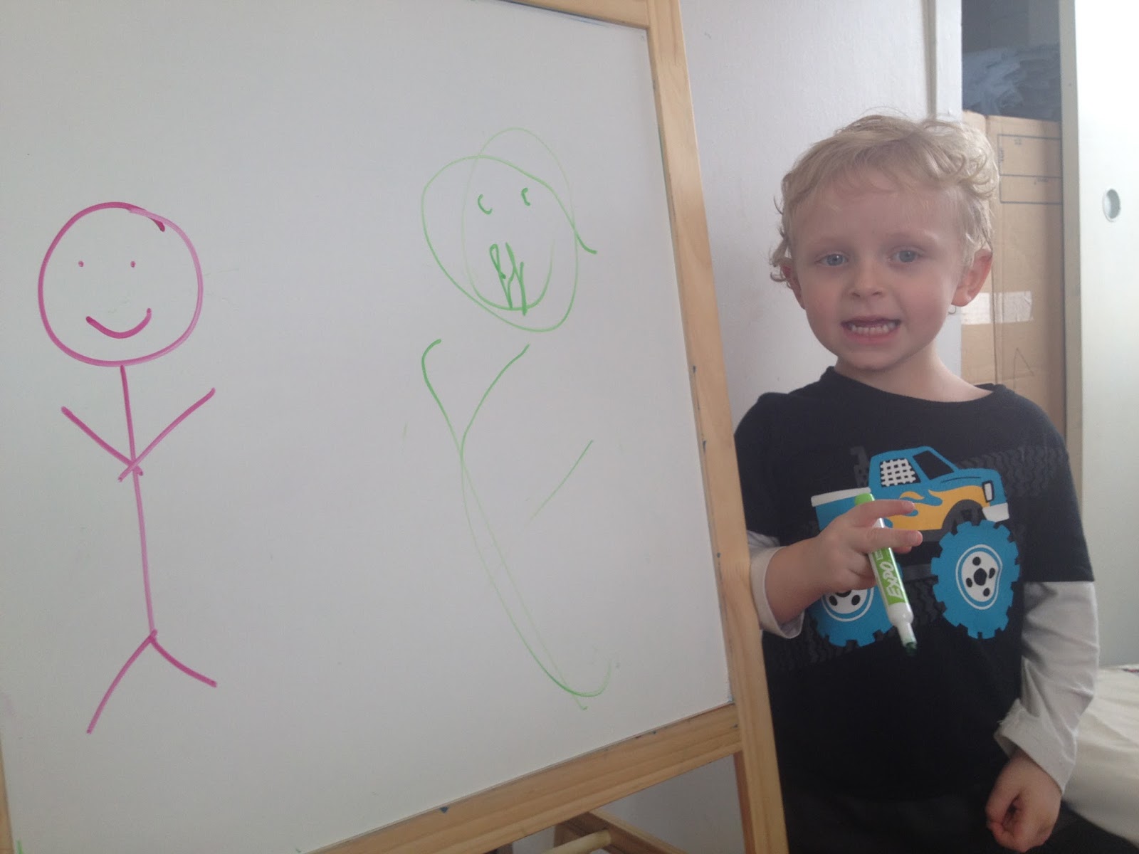 Sam drew a person (on the right) for the first time the other day. He made it a "grumpy" person and thought it was hilarious. |